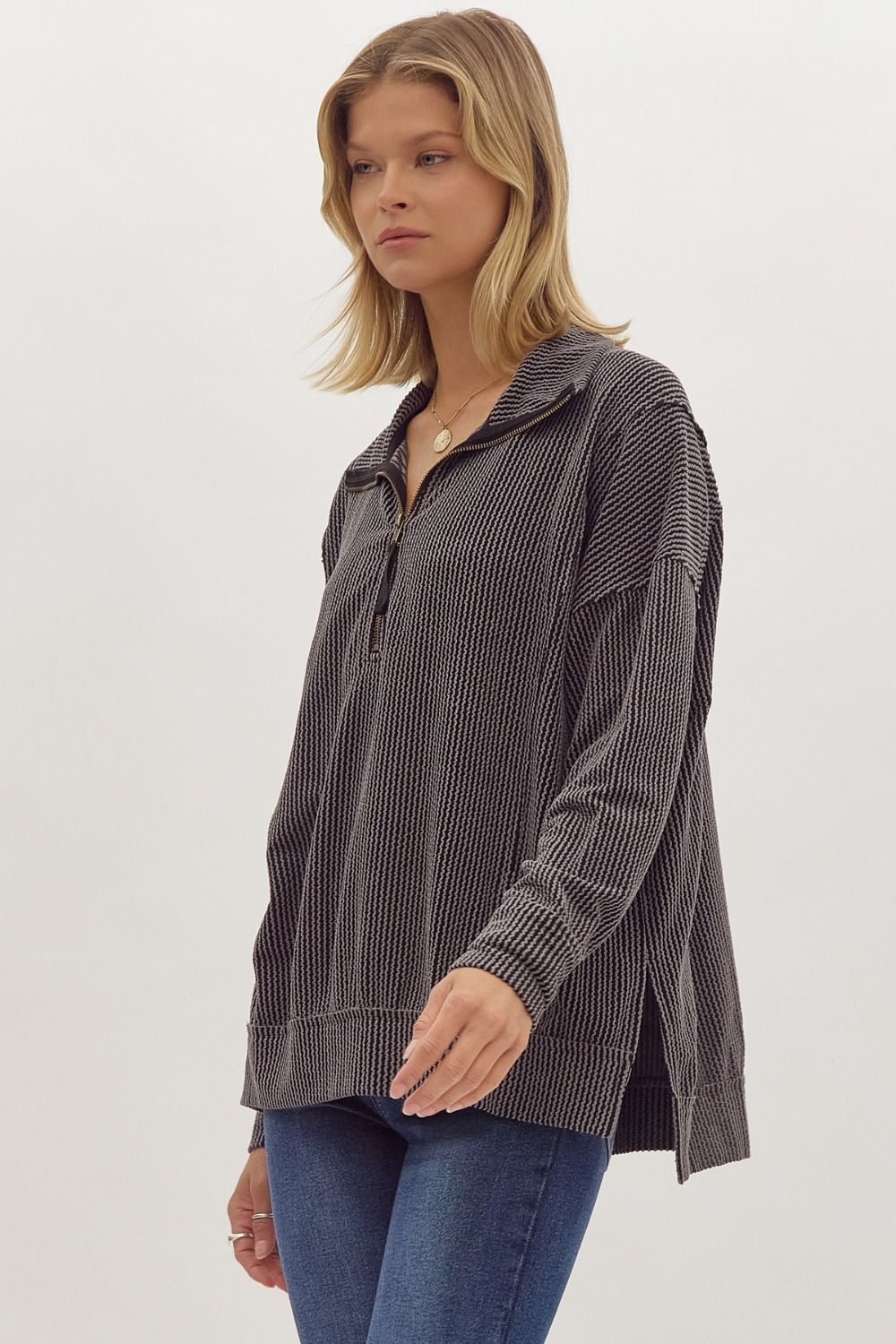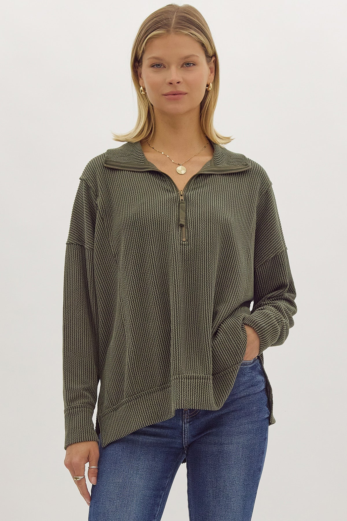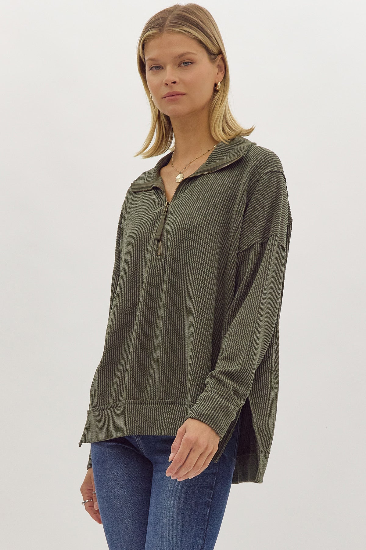 Entro Solid Ribbed Half-Zip Split Hem Top