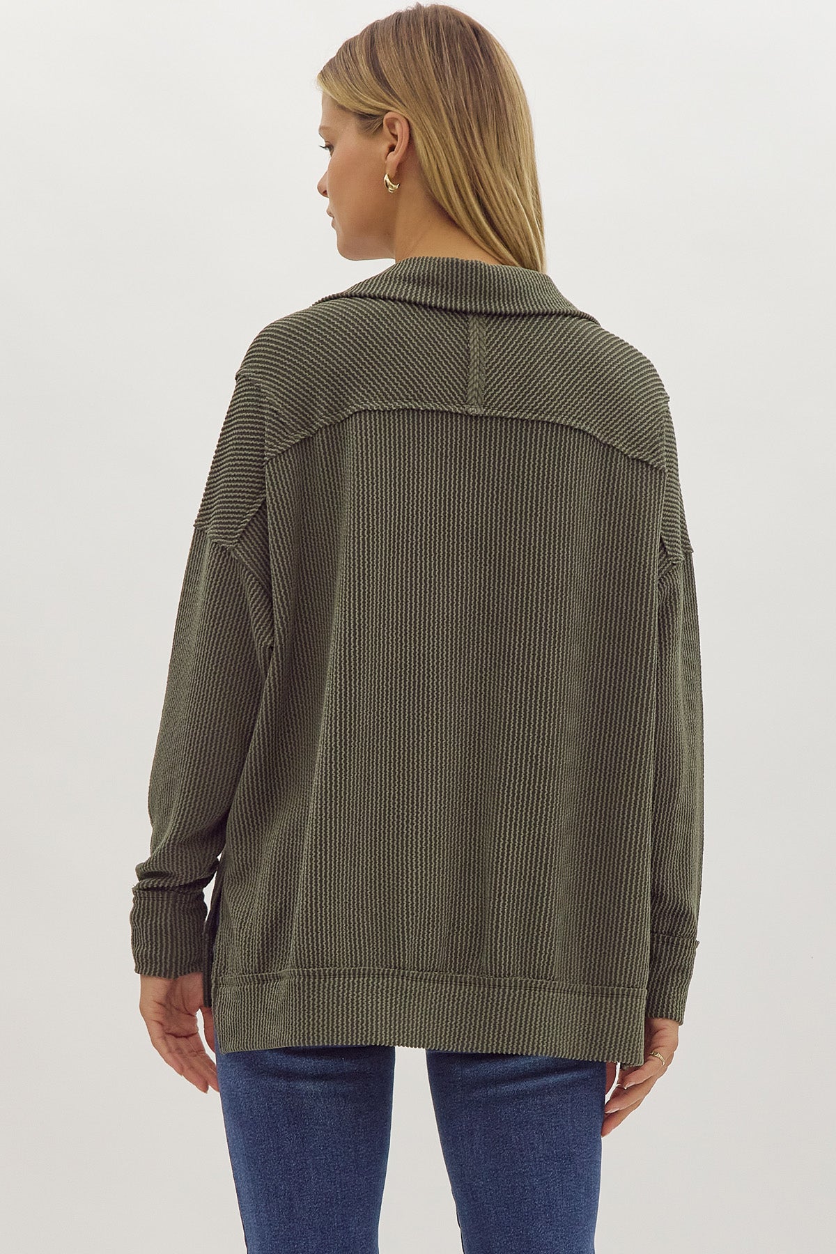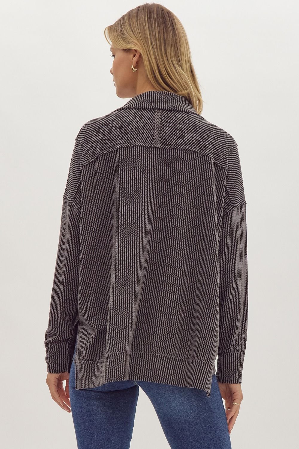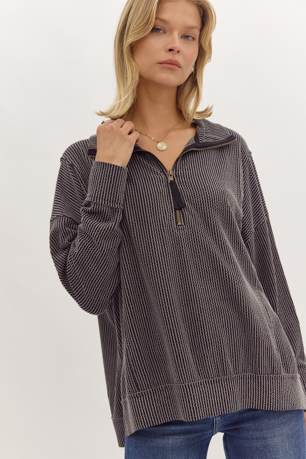 Entro Solid Ribbed Half-Zip Split Hem Top