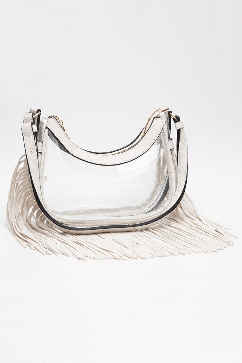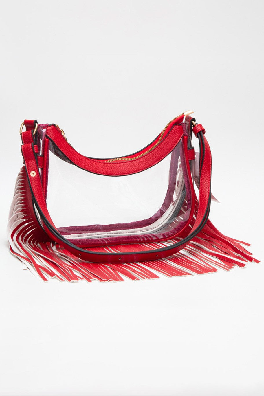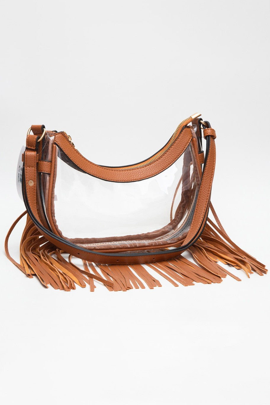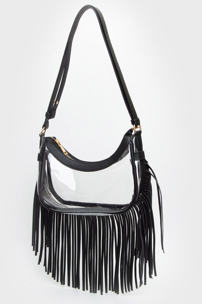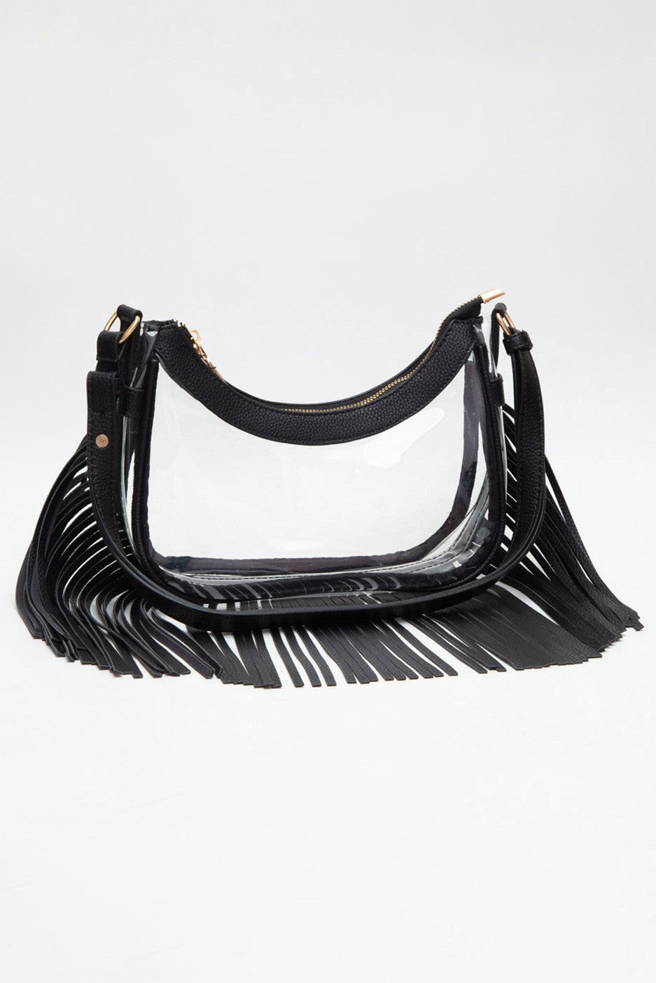 Size : 9.5" X 7" X 3" Strap Size : 40" L / Adjustable Zipper Closure Faux Leather Fringe Transparent Crossbody Bag