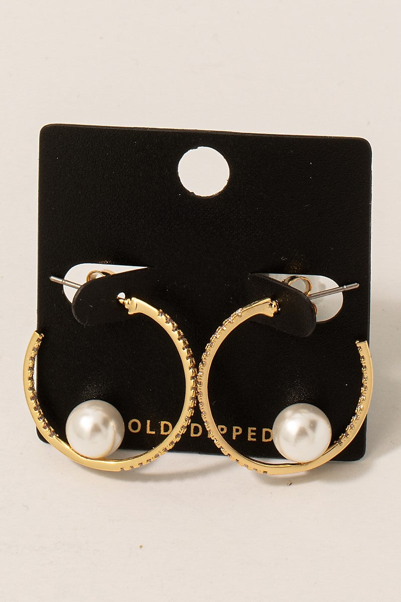 Gold Dipped Pearl Charm CZ Pave Hoop Earrings